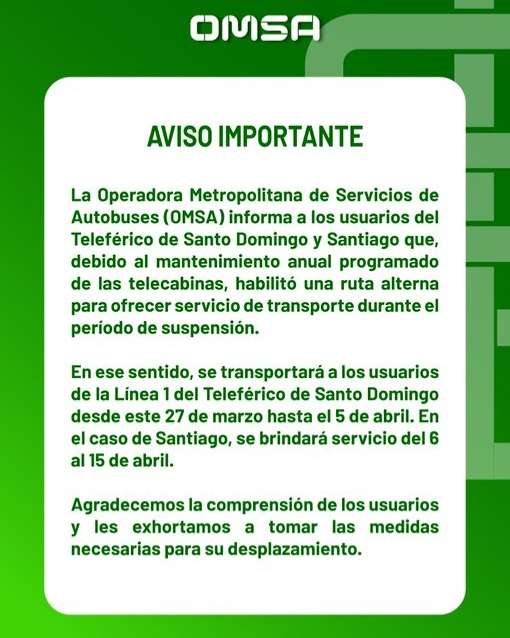 En Santo Domingo, la ruta alterna estará disponible del 27 de marzo al 5 de abril para los pasajeros de la Línea 1 del teleférico. En Santiago, el servicio alterno se ofrecerá del 6 al 15 de abril, con el objetivo de cubrir la demanda de los usuarios en ambas ciudades.